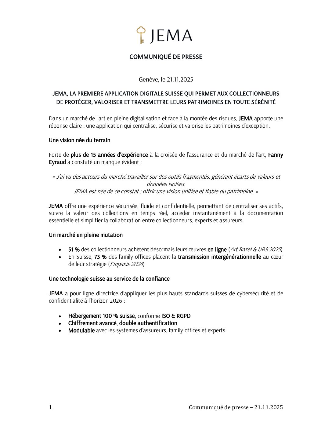 Fondée à Genève par Fanny Eyraud, experte du patrimoine et entrepreneure dans la tech, JEMA est la première application suisse à l’intersection de l’art, de l’assurance et de la donnée. Fruit de plus de 15 années d’expertise terrain, JEMA répond à un besoin concret: créer un outil digital de référence pour reconnecter les acteurs du patrimoine, instaurer une transparence nouvelle et sécurisée dans la gestion des actifs d’exception.